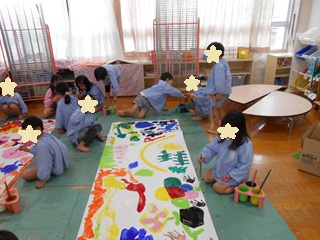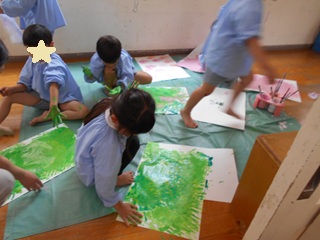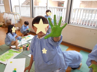3,4,5歳児それぞれ、絵の具を使う遊びを楽しんでいます。