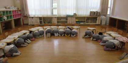 と放送が聞こえると、子どもたちは静かにを聞き、ダンゴムシポーズで頭を守っていました。
