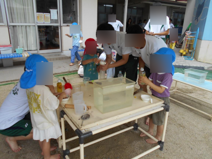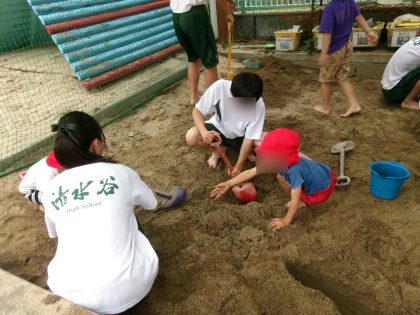 砂場で大きな池をつくって水を流したり、泥団子をつくったり、水鉄砲をしたり、お花を摘んで色水をつくったりと、いつも楽しんでいる遊びを高校生のお兄さんとお姉さんと一緒に楽しみました。