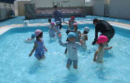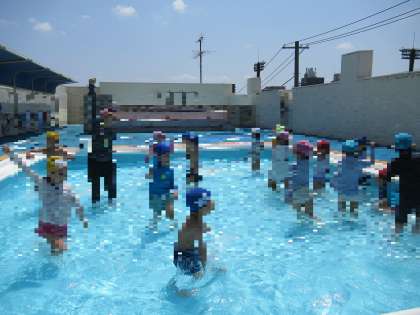 7月7日(月)、プール参観を行いました。連日の猛暑のため、暑さが心配でしたが、子どもたちは気持ちよさそうにプールに入っていました。初めの頃は、シャワーの勢いを弱めながら体を洗っていた子どもたちも、今ではすっかりシャワーにも慣れ、そら組(5歳児)は、一番勢いのあるシャワーでもしっかり浴びれるようになりました。プールの中では、『おふろやさん』に行ったり、走ったり座ったりなど各年齢に応じてしっかり水に慣らしてから、浮き輪をしたり、水鉄砲をしたり、潜ったりなど水に親しむ活動をしました。今日の参観でも子どもたちの笑顔がたくさん見ることができました。明日も参観があります。保護者のみなさま、暑い中参観に来ていただきありがとうございました。