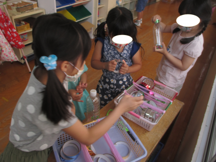 「ペットボトルの中にいろいろ入れたら、いい音なるよ」「かわいい飾りつけてみよう」「キラキラつけると光ってきれい」「大好きな魚の形にしてみたよ」など、それぞれ工夫してつくっていました。