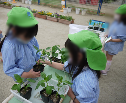 苗植えの前にはそれぞれのクラスで野菜の苗を見比べて、葉の付き方や形、色に違いがあることを確認しました。