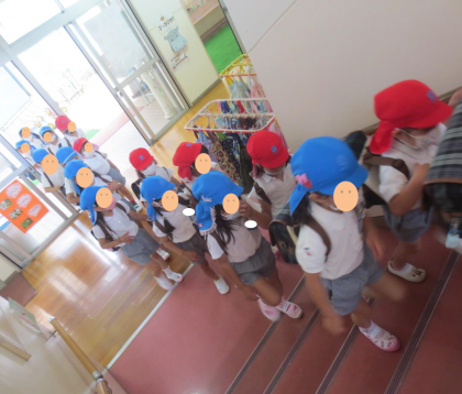 そこで、今日はそら・やま組とはな組でペアになって、園内を歩いてみました。「階段は手を離して行くよね」「建物側は、はな組さん。危ないからね」と確認しながら歩いていました。当日は、大きい組さんよろしくね!