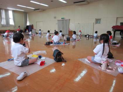その後はな組は、リズム室で持ってきたシートを広げお弁当を食べました。「遠足の時はお外で食べようね」