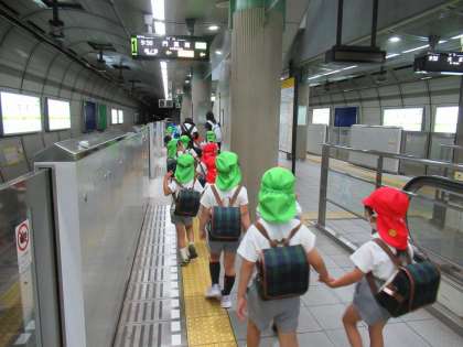 3日(金)に、4・5歳児が八幡屋公園に園外保育に出かけました。年長児が年中児の手を引いて幼稚園を出発し、大阪メトロに乗って行きました。年長児は、道路では建物側に、地下鉄のホームでは内側に、そして階段では手すり側にと、年中児が危なくない方を歩かせてくれました。歩くスピードにも気を配り連れて行ってくれました。さすがは、たよりになる年長さんです。