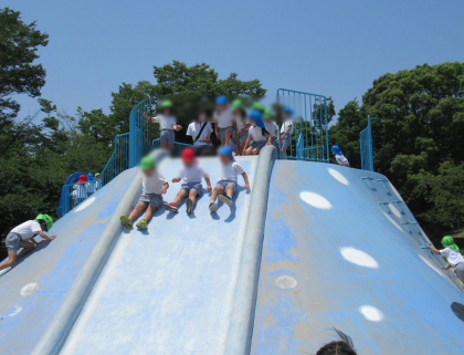 八幡屋公園には、大きなジンベイザメの遊具があります。幼稚園で事前に公園の写真を見せてもらっていたので、公園が見えてくると「あれやジンベイザメ!」「大きな滑り台もあるわ!」と期待がさらにふくらみました。登るのが難しい所にも挑戦したり、大きな滑り台で友達と滑ったり、思う存分遊びました。「おもしろいー」「楽しいー」と大喜びでした。