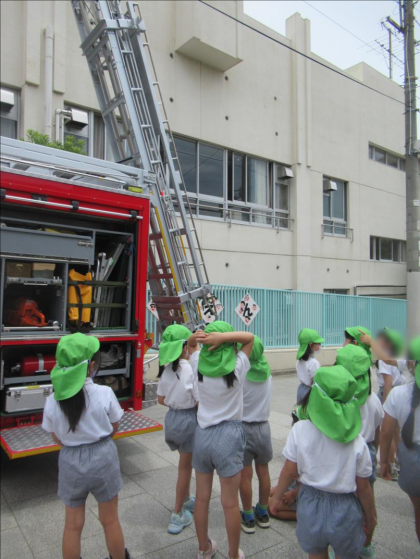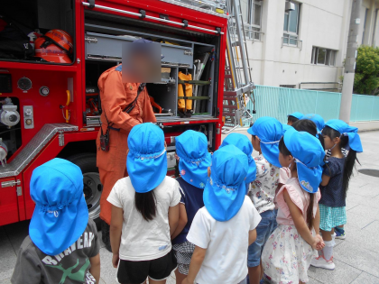 PTAの救急救命講習会の日、レスキュー車に乗って消防署の方が来てくださいました。年中児と年長児は、ご厚意でクラスごとにレスキュー車を見せていただきました。子どもたちは、間近で見るレスキュー車に興味津々でした。隅々までじっくりと見る姿が印象的でした。「ここには何が入っているんですか?」「はしごはどうやって使うんですか?」と消防署の方にいろいろなことを教えてもらい、「かっこよかった!」と嬉しそうでした。