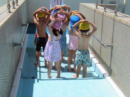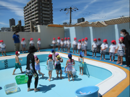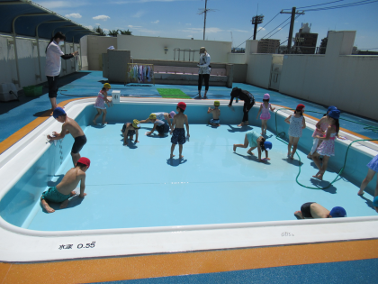 掃除した後は、水の入っていないプールの中で、水鉄砲をしたり、ホースからのシャワーにかかったり、全身で水の気持ちよさを感じていました。プール遊びが楽しみです。