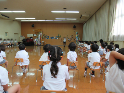 今日は七夕です。各クラスで、四角つなぎや貝殻つなぎ、輪つなぎやスイカなど、いろいろな飾りをつくったり、短冊にお願い事を書いて、大笹に飾りました。リズム室にみんなで集まって、七夕のお話を見たり、『たなばたさま』の歌を歌ったりしました。みんなのつくった飾りがついた笹はとてもきれいでした。