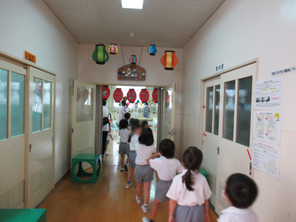 「入口に、なつまつりって書いてある!」明日は待ちに待った、こども夏まつりです。保護者の方々が、何日も前から子どもたちを楽しませようと、楽しいお店を用意してくださいました。