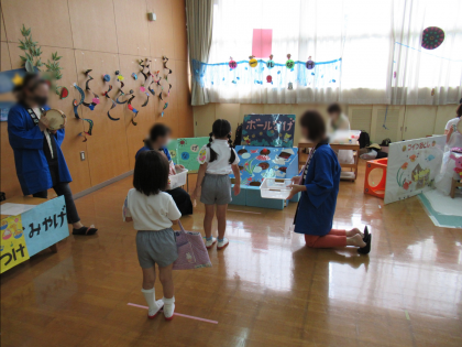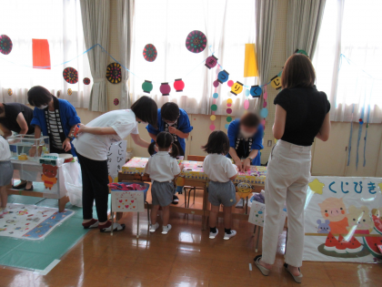いよいよこども夏まつりの当日がやってきました。みんな、楽しみではりきって登園してきました。いつもよりも登園時の身支度を済ますのがちょっと早かったです。