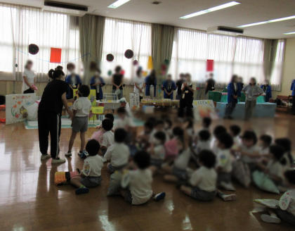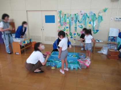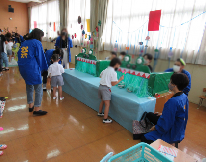 「ボール入った!」「魚釣りの釣り竿のひも、一番長いので挑戦してみた。でも、3匹釣れたよ」「コインぜーんぶコップに入ってん」とどの子も楽しんでいました。好きなお店で何回も遊べるので、すいているお店を見つけていっぱい遊びました。「コイン落とし4回もしてん」とお気に入りのお店を見つけて、何回も挑戦している子どももたくさんいました。お土産もいっぱいもらい、おうちに帰ってからお土産で遊ぶのも楽しみです。