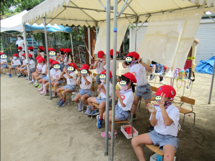 3歳児もも組はみんなでジャングルに出掛けました。いろいろな動物になって楽しそうに遊んだり、雷ドンとも仲良くなれたりしました。
