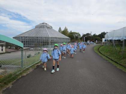 サバーファームに到着したら、芋畑まではコスモス畑やブドウ畑を見ながら、歩きました。年長児が年少児と手をつないで、芋畑まで連れて行ってくれました。