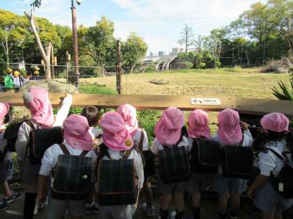 天王寺駅に着き、てんしばを歩いていくと、動物園が見えてきました。「動物園見えた」と興奮気味の子どもたち。動物園の中では、クラス毎に分かれて行動しました。5歳児は、昨日それぞれ見たい動物を出し合い、どの動物を見て回るのか事前準備はバッチリです。