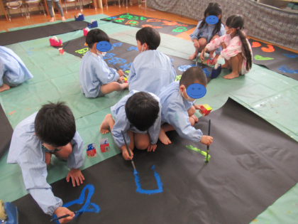 明後日の27日は子どもフェスティバル(作品展)です。遊びの中でかいたり、つくったりしたものを、お家の方にみていただきます。クラス毎にテーマがあり、それに合わせて友達同士でアイデアを出し合い、力を合わせて飾り付けをつくっています。入口に飾る大きな紙にみんなで絵をかいたり、みんなでかいた紙を、力を合わせて貼ったりして準備しました。早く、みんなに見てほしいなー。