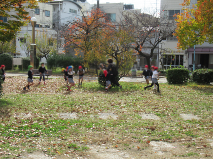 公園の木々は赤や黄色に紅葉していて、きれいな落ち葉がいっぱいで絨毯のようになっていてました。そんな、秋の自然の中で、探検しているとキャンプのテントみたいになっている木を見つけたり、木の迷路を見つけたりしました。きれいな葉っぱを見つけて拾ったり、「落ち葉合戦」をしたり、おにごっこをしたりたくさん遊びました。