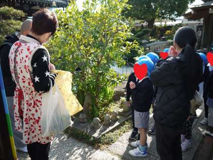 年長児は、地域の方のところにご挨拶に行きました。「今年もお世話になりました。来年もよろしくお願いします。」と丁寧に挨拶していました。みんながつくった干支のカレンダーや幼稚園で育ったぎんなんや野菜をプレゼントすると、大喜びしてくださいました。