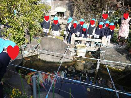 5月にお散歩に出かけた時にえさやりをしていた鯉も、冬は冬眠しているそうで、みんな同じ向きで眠っている様子を見せていただき、「鯉ってこうやって寝るんや!」と子どもたちもびっくりしていました。