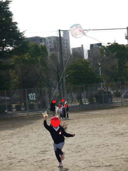 子どもたちが気持ちを込めてかいた絵が空高く上がり、「とんだ〜!」と笑顔を見せたり、「もっと遠くにとばそう♪」と糸を長くしてとばすことに挑戦したりしていました。