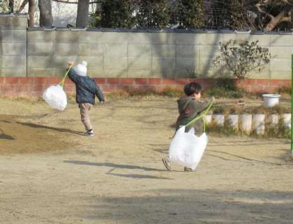 手つきビニール袋の凧が作れるように用意しておくと、「作りたい」とお家の方と一緒に集まってきてくれました。袋に好きな絵をかいて、ひもを付けると出来上がり!そら組さんも「このマジックでかいたらいいよ」といろいろと優しく声をかけてくれていました。中には「お名前書いてあげるわ」と名前を聞いて一生懸命に書いてあげているそら組さんもいました。