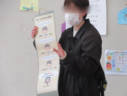 最後に養護教諭から、「秘伝 よくかむための忍法帖」としてよく噛んで食べるためのポイントを記した掛け軸をクラスにプレゼントしました。