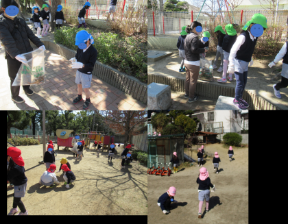 24日に雨天で2回延期になった「クリーンUP作戦」を実施しました。本園では、いつも遊んでいる、隣の真田山公園をきれいにしています。「ゴミや落ち葉は落ちていないかな」と軍手をはめて一生懸命探して拾い集めました。「お菓子のごみ落ちてる」「ペットボトルも捨ててある。ちゃんとゴミ箱に捨てたらいいのに」「この枝は小さい子には危ないから拾っとかな」「ガラス危な!」いろいろなゴミが落ちていました。もも組は園庭のゴミを拾い、幼稚園がきれいになりました。「クリーンUP作戦」を経験した子どもたちには、きっとゴミはゴミ箱に捨てないといけないということが実感できたと思います。