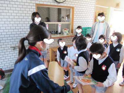 高津中学校の生徒会のお兄さん、お姉さんがエコキャップ回収運動をして、絵本をプレゼントしてくださいました。幼稚園は春季休業中なので、今日の預かり保育に参加していた子どもたちが代表していただきました。面白そうな絵本に子どもたちもワクワクしています。新学期から手に取って見られるようにしておきます。楽しみにしておいてくださいね。高津中学校の皆さん、楽しそうな絵本を、ありがとうございました。