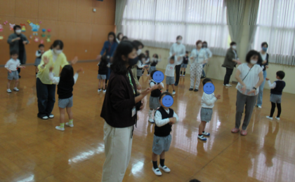 お天気はあいにく雨でしたので、園庭での遊びは見ていただけませんでしたが、室内で体操をしたり、仲良し遊びをしたり、そら組はリレーをしたりして遊んでいる姿も見ていただきました。リレーは白熱し、子どもたちのリクエストに応えて3回もしていました。