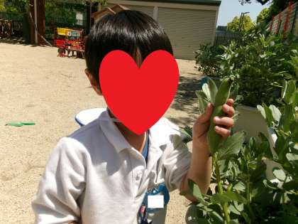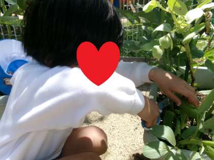 今日は、そら組さんがソラマメを収穫しました。去年はな組さんだった時に植えたソラマメが大きく育ち、「めっちゃ大きいな♪」「ソラマメの中身って絵本のそらまめくんのベッドみたいにほんまにふかふかなんやね!」などと話しながら収穫を楽しんでいました。