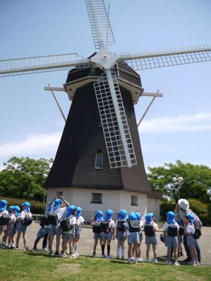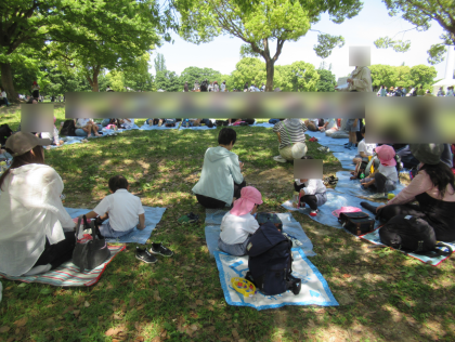 ももぐみさんは、おうちの人と一緒に大芝生で楽しくお話をしました。そらぐみさんとはなぐみさんは、それぞれ風車を見にいったり木の実拾い・花摘みをしたりしました。