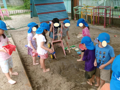 友達と力を合わる楽しさや、水や泥の感触を存分に楽しんでいました。
