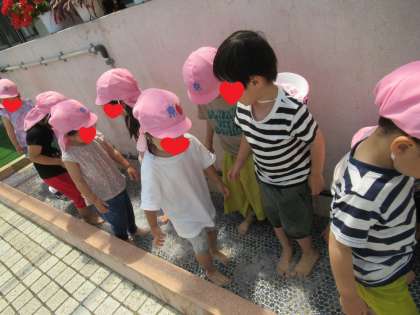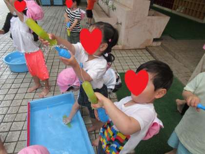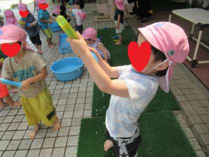 今日は、みんなで水鉄砲をして遊びました。はじめは、「どうやって水を入れるの?」と困っている姿もありましたが、遊んでいるうちにコツをつかんで水をとばして遊ぶことを楽しみました。