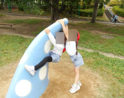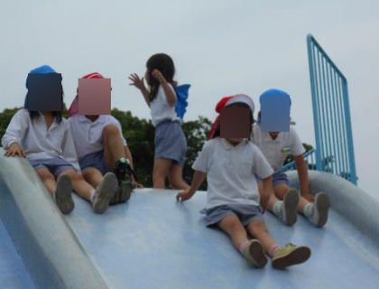 「楽しい!」「おもしろい!」と何度も滑ったり、「ジンベイザメのしっぽある!」と遊んだりして楽しみました。また、シロツメクサなどの草花を摘んで遊ぶ姿も見られました。