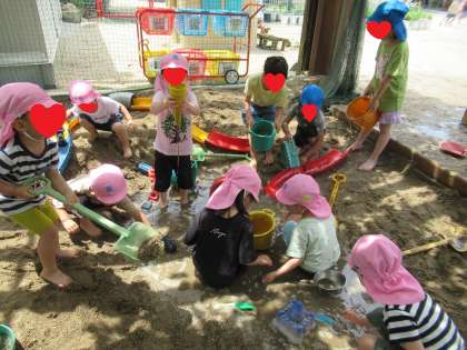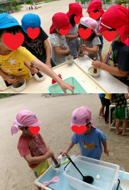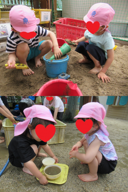 最近は毎日天気がいい日は、園庭で夏の遊びを存分に楽しんでいます。教師が一緒に遊んでいると、「見て〜!○○くんとコーヒーつくってるの!」と話したり、泥水をみそ汁に見立てて、「いただきま〜す♪」と遊んでいたり、穴を掘ってたくさんの水を流して、「プールみたいだね!」と遊んだりする姿が見られました。色水の遊び場では、そら組やはな組の友達の様子を見て興味をもったのか、もも組さんも同じような材料をもってきて、まねっこをして遊ぶ姿が見られました。