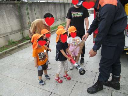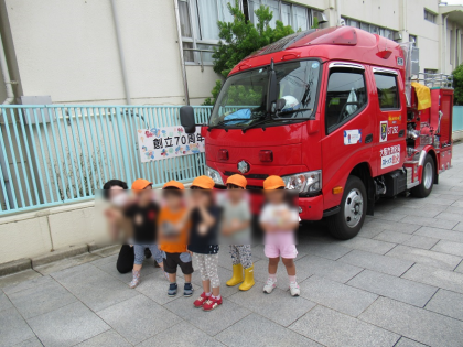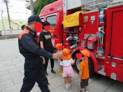 ひよこさんも消防車見学をしました♪間近で消防車を見ることができて、とっても「うれしそうな表情をしていました。最後は、消防車の前でパシャリ♪