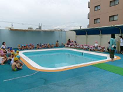 今日からプールが始まりました。プールに入る前に、園長先生が、みんながけがをしないで楽しくプール遊びができますようにと魔法の粉(塩)をまいてくださいました。