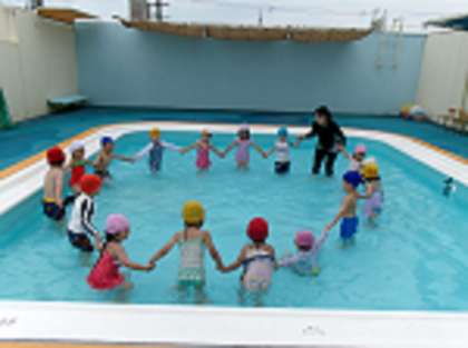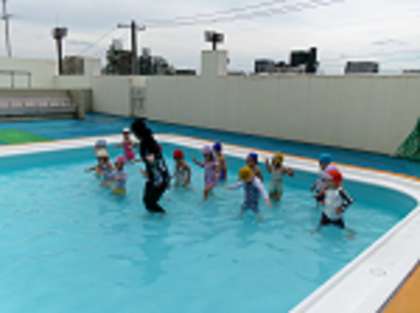 プールの中では、ウサギさんや鳥さんになって遊んだり、「バスにのって」の音楽に合わせてみんなで遊んだりしました。