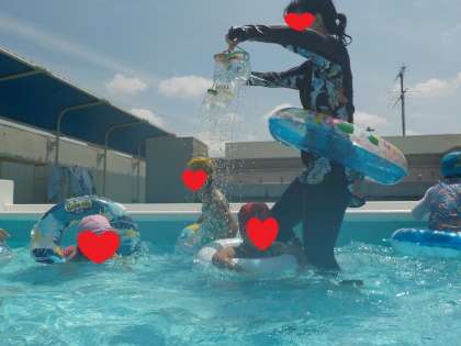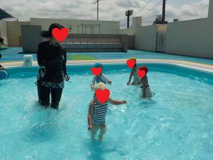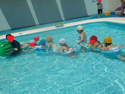 今日は新しい浮き輪を使ってみんなで遊びました。遊んでいるうちにみんなが繋がりはじめ、浮き輪電車になりました♪これからいろいろな遊び方を楽しみながら、「今日も楽しかったね♪」「プール明日も入りたいな!」と思えるように援助していきたいと思います。
