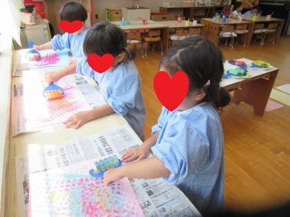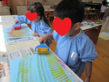スポンジローラーで、いろいろな模様をつけて遊ぶことを楽しんでいました。