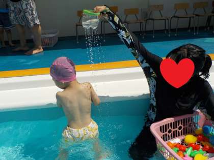 プールの中でも、ペットボトルシャワーで背中だけ濡らしてみたり、少しだけ頭の上に雨を降らしてみたりして、「今5数えるまで頑張れたよ!」「次は6まで頑張ってみよう♪」などと話しながら、無理なく少しずつ水に親しめるように教師や友達と一緒にプール遊びを楽しんでいます。