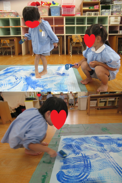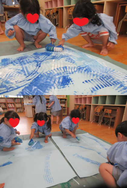 大きな模造紙に、友達と一緒にローラーをしながら、青色系の絵の具の場所では、「海ざっぶ〜ん♪」と話しながら転がしたり、緑色系の絵の具の場所では、「ここに恐竜の足跡かこう!」「ガオ〜!」言ったりしながら、それぞれ教師や友達と一緒にイメージを通わせながらローラー遊びをしていました。いつの間にか手や足にも絵の具の色がついていました♪