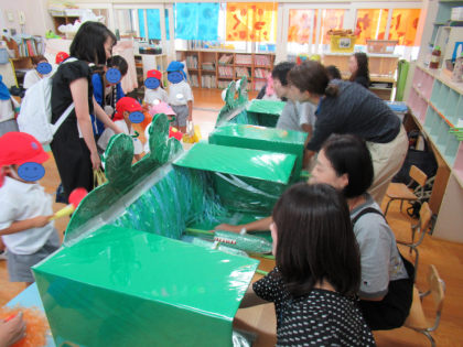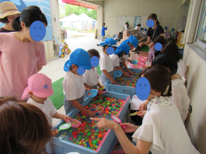 12日はPTA主催のこども夏祭りでした。PTA委員の皆さんが子どもたちのために、いろいろな夏祭りのお店を用意してくださいました。ヨーヨー釣り、ボール投げ、スーパーボールすくい、ワニワニパニックゲーム、コイン落とし、輪投げ、ゴールシュートなどたくさんのお店ができました。3歳児もも組はお家の方と一緒に、4歳児はな組と5歳児そら組はペアになって、お店を回りいっぱい遊びました。どのお店でも、とても楽しそうに遊んでいました。最後はお土産ももらいました。「楽しかった」「もっと遊びたい」「お土産いっぱいもらった」と子どもたちは大興奮!