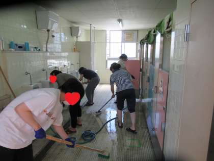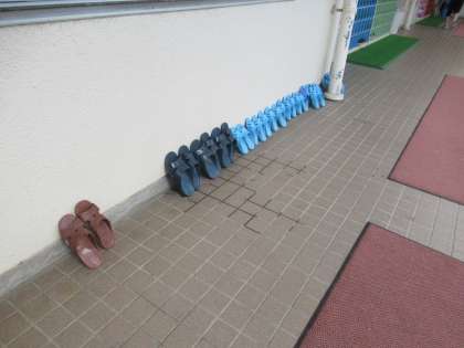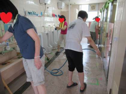 毎日、子どもたちが帰った後に事業担当主事補さんがトイレの掃除をしてくれていますが、今日は教職員全員で重たいすのこをあげて床を磨いたり、スリッパを洗ったりしてトイレの掃除をしました。