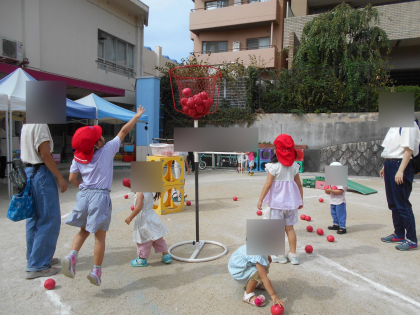 今日は、ふれあいデーがあり、地域の未就園の子どもたちが遊びに来てくれました。はなぐみの子どもたちに小さなお友達が来てくれることを話すと、「優しくしてあげたい」「滑り台が楽しいから教えてあげる」と、一緒に遊ぶことや幼稚園のことを教えてあげることを楽しみにしていました。園庭に出ると、すぐに遊びに来ているお友達を見つけて声をかけていました。いつも楽しんでいる玉入れの玉を渡して誘いかけたり、砂場で一緒に遊んだりして楽しんでいました。遊んだ後には、「楽しかった」「また来てほしい」と、また一緒に遊ぶことに期待をふくらませていました。