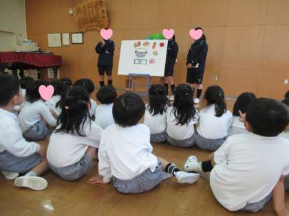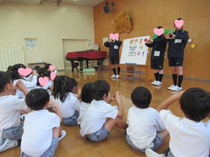 幼児教育コースで勉強している高校生のお姉さんが、3日間実習に来てくださり、最終日にパネルシアターで「カレーライスのうた」をしてくれました。一緒に歌を歌ったり、パネルの仕組みに興味をもったりしながら楽しそうにお話を聞く姿が見られました。