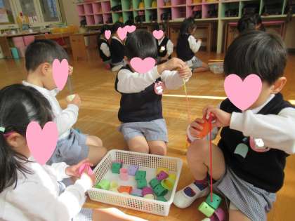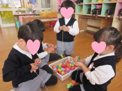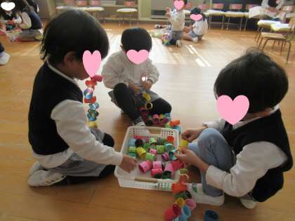 輪つなぎは少し難しいので、穴のあいた輪っかの画用紙を紐に通して、みんなでカラフルな飾りをつくりました。作品が完成してすぐに部屋の玄関に飾ると、「○○君のめっちゃいっぱいあるな!」「〇〇ちゃんのピンクがいっぱいでかわいいな!」などと飾りを満足そうに褒めあう様子も見られました。