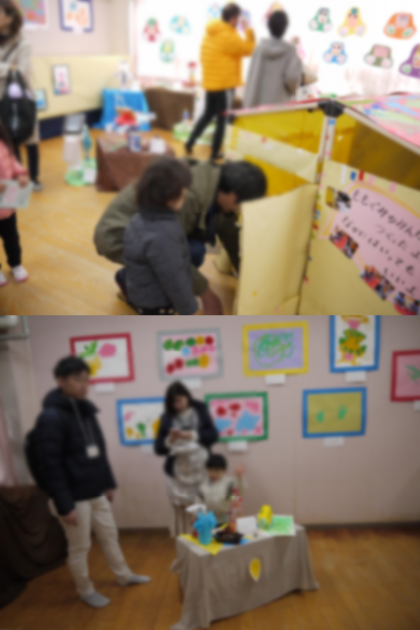 子どもたちがかいたりつくったりした作品を各保育室に展示し、観覧しました。