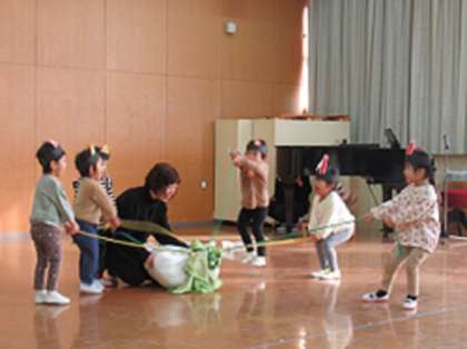 今日は、好きな動物に変身して、大きなカブを引っ張って遊んだり、歌や楽器遊びも楽しんで取り組んでいました♪