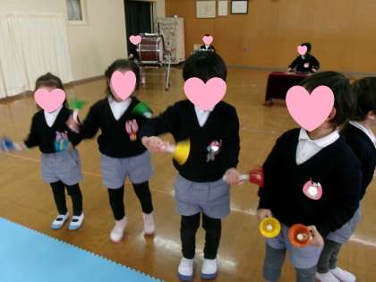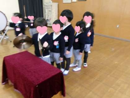 「トライアングルってめっちゃきれいな音やな」「大太鼓かっこいい!」「シンバル音大きい〜♪」など嬉しそうに大きい組さんのまねっこをしながら音を鳴らして遊ぶことを楽しんでいました。